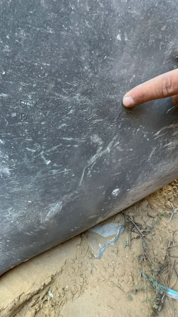 The munition used has been classified on Airwars’ Open Source Munitions Portal cases OSMP505 and OSMP506. Analysts classified this as likely a 2000lb bomb, with the tentative model a MK 84 based on munition remnants found after the strike and posted by @adham922.