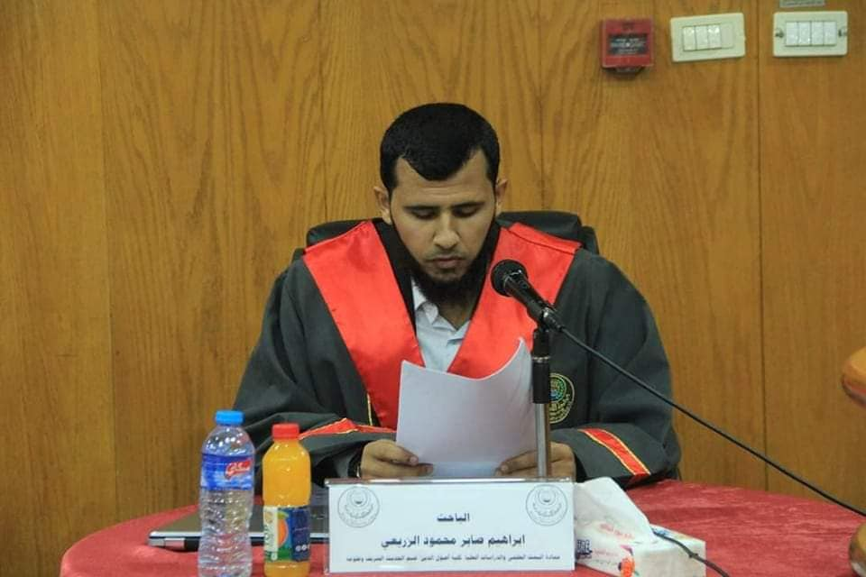 Muhammad Abu Samra provided a video of Ibrahim Saber Al-Zari’i receiving his master’s degree in Hadith sciences and interpretation from the Islamic University of Gaza.