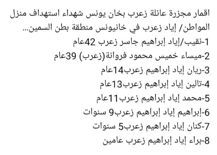 Among those killed were Police Captain Iyad Ibrahim Jasser al-Barqi Zorob (42 years old) and his wife Dr. Maysaa Khamis Mahmoud Farwana Zorob (39 years old), alongside their 13-year old daughter, Talin Iyad Ibrahim Zorob, and four of their five sons: 2-year old Baraa Iyad Ibrahim Zorob, 5-year old Kenan Iyad Ibrahim Zorob, 9-year old Ibrahim Iyad Ibrahim Zorob, and 14-year old Rayan Iyad Ibrahim Zorob. Sources were conflicted as to whether their 11-year old son, Muhammad Iyad Ibrahim Zorob, sustained injuries and survived the bombardment or was among those killed.