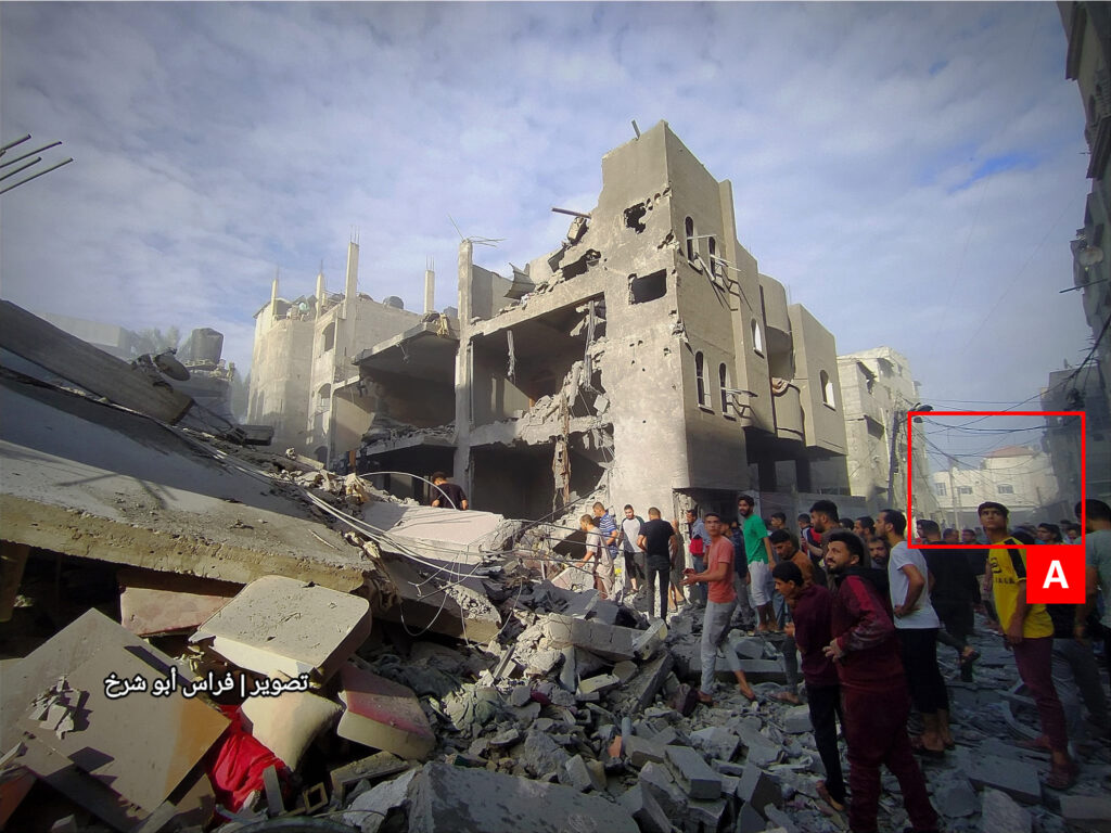 Reports of the incident mention the vicinity of Kuwaiti Hospital (المستشفى الكويتي) in the city of Rafah (رفح). Analysing audio-visual material from sources, we have narrowed the location down to the following exact coordinates: 31.289743, 34.251428.