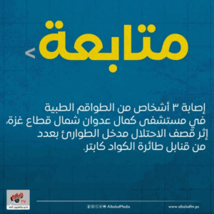 Several sources, including Shehab Agency, Alarabiya Palestine, and Albalad News Network, confirmed the method of attack as a drone-launched bomb and consistently reported three medical personnel injured, with at least one in critical condition “and undergoing complex surgery in the operating room”.