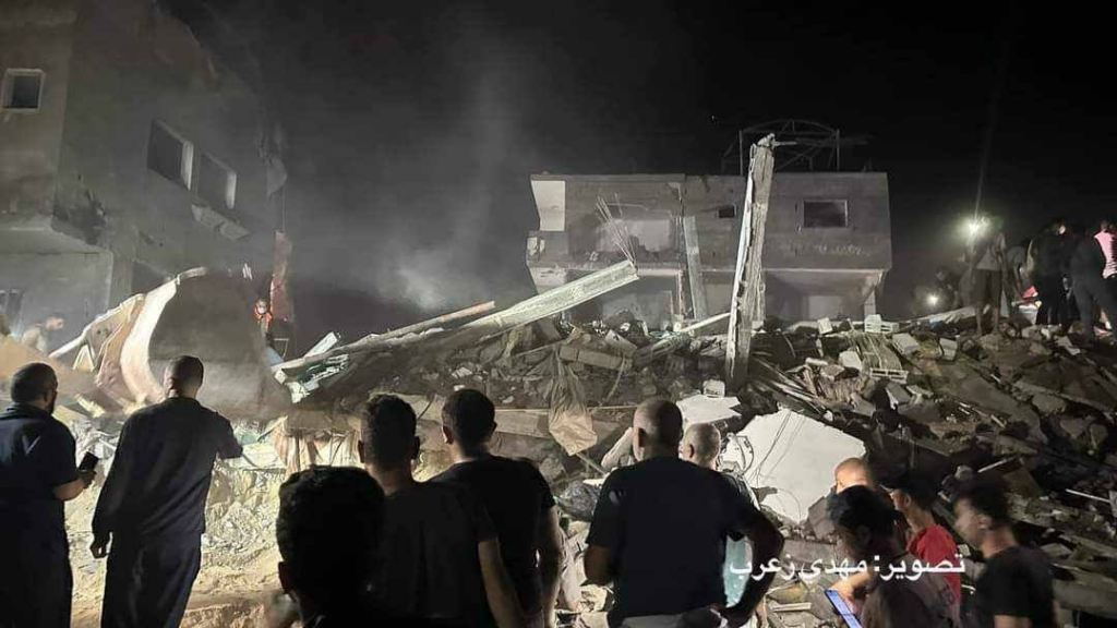 The local sources mentioned “bombardment” and did not indicate whether that was artillery strike or airstrike. Several sources shared photos depicting a large heap of rubble, where a now destroyed building once stood, surrounded by groups of men searching in the darkness for missing people beneath.