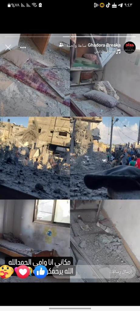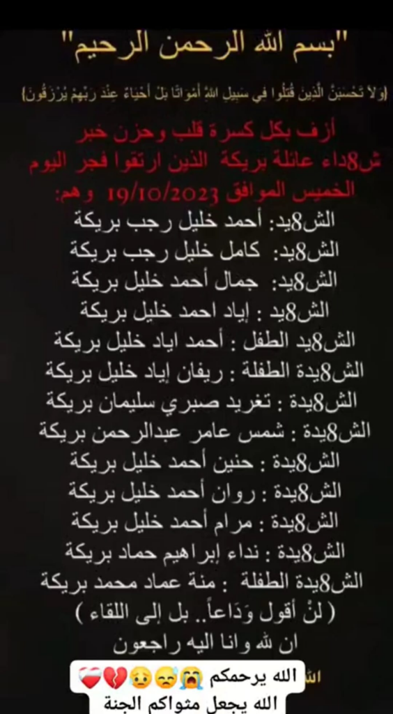 A Facebook user Akhmed Zorub posted a condolence message for his neighbours, the Barika family, and shared images of some of the victims. A family relative Abboud Mahmoud Barika wrote that “I cry with all the broken heart and sadness of the news”, and also shared some images, including those of the deceased children. Another family relative, Ahmed Khaled Barika, posted that “Today I bid farewell to my uncles and their children and grandchildren”. In his post, the images of some women who were killed in the strike could be seen.
