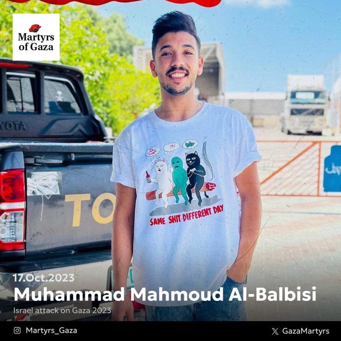 On October 17th, 2023, Muhammad Mahmoud Al-Balbisi (25) was killed by an alleged Israeli airstrike in the Gaza Strip.