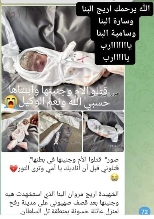 One of the victims of this airstrike was a pregnant 25-year old woman Areej Marwan Al Banna who was killed alongside her daughters Sara Al Banna (14) and Samia Al Banna (10) and her unborn child. Distressing images and videos of the six month-old foetus, later covered in a small shroud, were shared by sources on social media. It was reported that dozens of people in the city of Rafah mourned the deceased Areej.