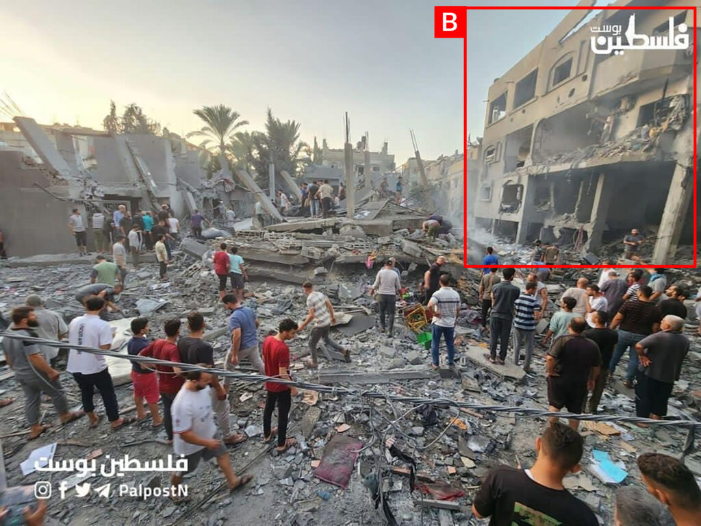 Reports of the incident mention a residential building being struck in the vicinity of the Yafa Hospital (مستشفى يافا الطبي) in the town of Deir al-Balah (دير البلح). Analysing visual material from sources we have narrowed down the location to these exact coordinates: 31.418509, 34.346878.