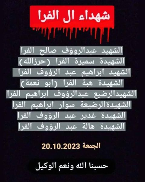 Among those killed were grandfather 70 year old Abdul Raouf Saleh Ali al-Farra and his wife 60 year old Samira Muhammad Harzallah, alongside their two daughters, 21 year old Ghadeer Abdel Raouf Saleh al-Farra and 25 year old Hala Abdel Raouf Saleh al-Farra, their son, 32 year old Ibrahim Abdel Raouf Saleh al-Farra, and their daughter-in-law, Heba Salim Abu Nimah. The incident, reported by The Palestine Post (@PalpostN) and Twitter/X user @ehabomar21 to have occurred in the early morning hours of Friday, also claimed the lives of Abdul and Samira’s grandson (Heba and Ibrahim’s children), less than a year old Abdel Raouf Ibrahim Abdel Raouf al-Farra, and granddaughter, 1 year old Siwar Ibrahim Abdel Raouf al-Farra, as well as the Hadayed family’s young member Raed Abu Hadayed and his wife, whose name is still unknown. @ehabomar21’s tweet mentioned that “there were no survivors under the rubble” and a post from Yaser Mouaye Alfarra mentioned that at the time, the child Samira Ibrahim al-Farra’s body was still under rubble, indicating that young Samira was among those killed.