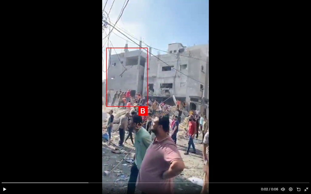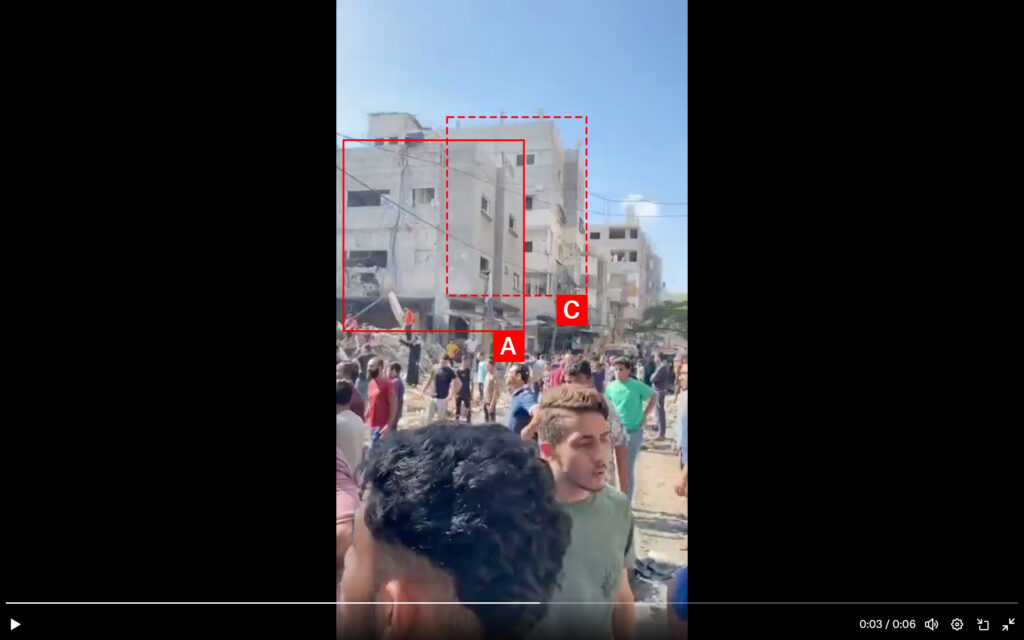 Reports of the incident mention a residential building being struck on Yarmouk Street (شارع اليرموك) in Gaza City (مدينة غزة). Analysing audio-visual material from sources, we have narrowed the location down to the following exact coordinates: 31.523441, 34.464771.