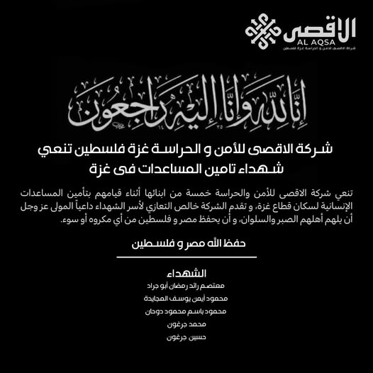 On Facebook, user Rania Khodary reported on “Martyrs of the Aid Security Company (Al-Aqsa Security and Guarding Company)”, writing that four individuals and an “unidentified martyr” were “targeted by a car on Salah al-Din Street”.