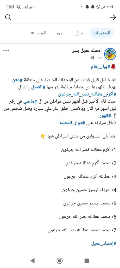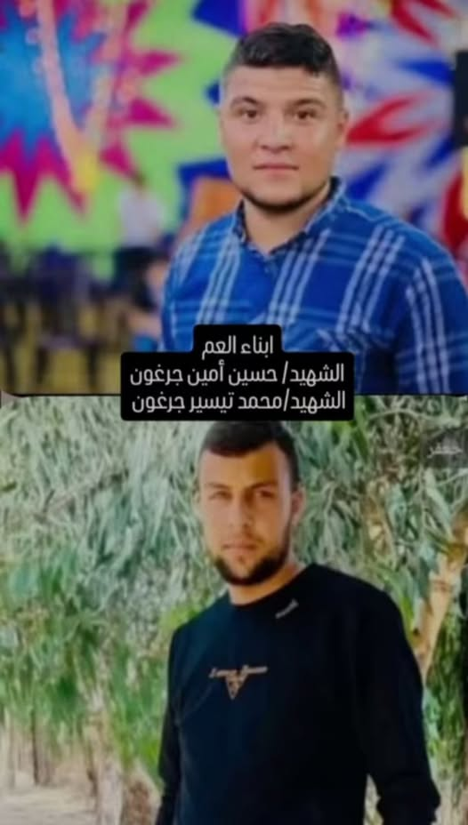 Hussein and Muhammad Jarghoun have been recorded as militants. This classification comes from two posts, shared by Facebook user Hisham Jargoun, in which Hisham identifies Hussein by name, and seemingly also refers to Muhammad as his lists family members who were killed as well. In a post from January 4th, Hisham wrote that “The two had been part of the Palestinian military organization “Al-Qassam Brigades” for years.” In another post from January 6th, Hisham wrote that “The Palestinian Arab Military Institution honors its martyrs: Martyr Muhammad Taysir Jargon, “Military Intelligence.” Martyr Hussein Amin Jargon, “Field Unit.”” Hisham added that the two “ascended while on a mission to secure food for the displaced, oppressed, and grieving people.”