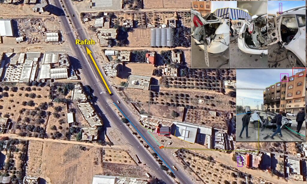 Reports of the incident mention a strike on Salah al-Din Street (شارع صلاح الدين) to the north of Khan Younis (خان يونس). This incident was independently geolocated by Abu Location أبو لوكيشن (@AbuLocation). Satellite imagery shows the strike location at the following exact coordinates: 31.368306, 34.331334.