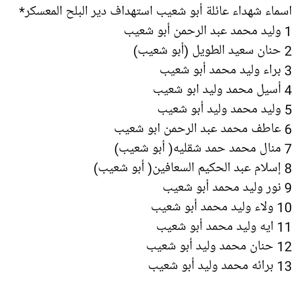 The Ministry of the Interior in Gaza identified the ‘Abu Shuaib’ residence as one of two homes that were allegedly struck by the Israeli military in Deir Al Balah neighbourhood, in the Central Governorate. The grandparents of the family, Walid Muhammad Abd al-Rahman Abu Shuiab and his wife, Hanan Saeed Al-Taweel Abu Shuaib were killed, along with their four children: Baraa Walid Muhammad Abu Shuaib (son), Nor Walid Muhammad Abu Shuaib (daughter), Walaa Walid Muhammad Abu Shuaib (daughter) and Aya Walid Muhammmad Abu Shuaib (daughter). The wife of Baraa Ab Shuaib, Islam Abdul Hakim Al-Saafin Abu Shuaib, was also killed along with their four children: Walid Muhammad Walid Abu Shuaib (son), Aseel Muhammad Walid Abu Shuaib (daughter), Hanan Muhammad Walid Abu Shuaib (daughter) and Baraa Muhammad Walid Abu Shuaib (daughter).