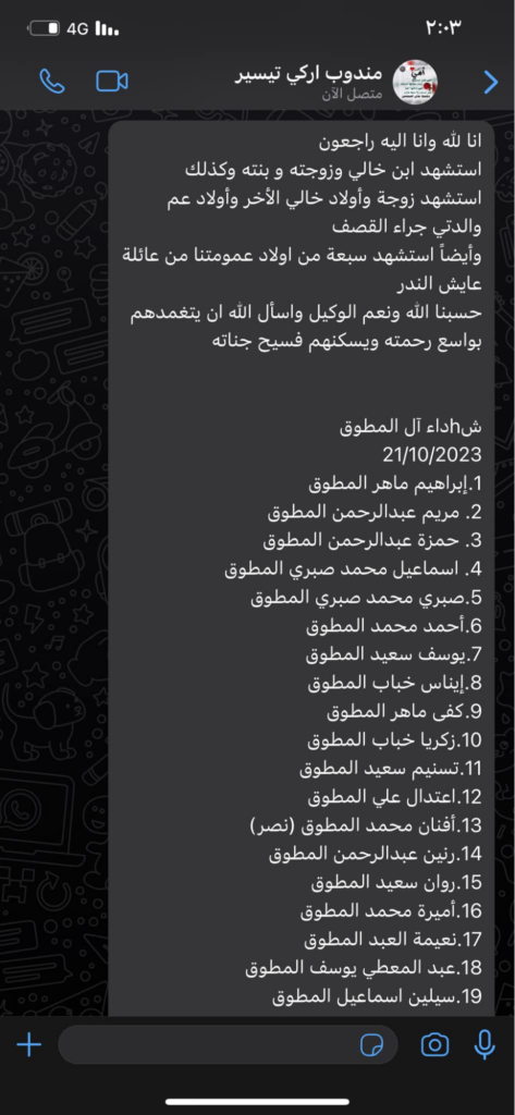 Other family members were also identified but couldn’t have their exact relationships verified. Two male family members called Kholoud Al-Moutawaq and Abdul Muti Yousef Al-Abd Al-Moutawaq (aged 49) were killed. Three female family members 63-year-old Etidal Ali Muhammed Al-Moutawaq, Naima Al-Abd Al-Moutawaq and Afnan Muhammad Al-Moutawaq (Nasr), were also reported killed.