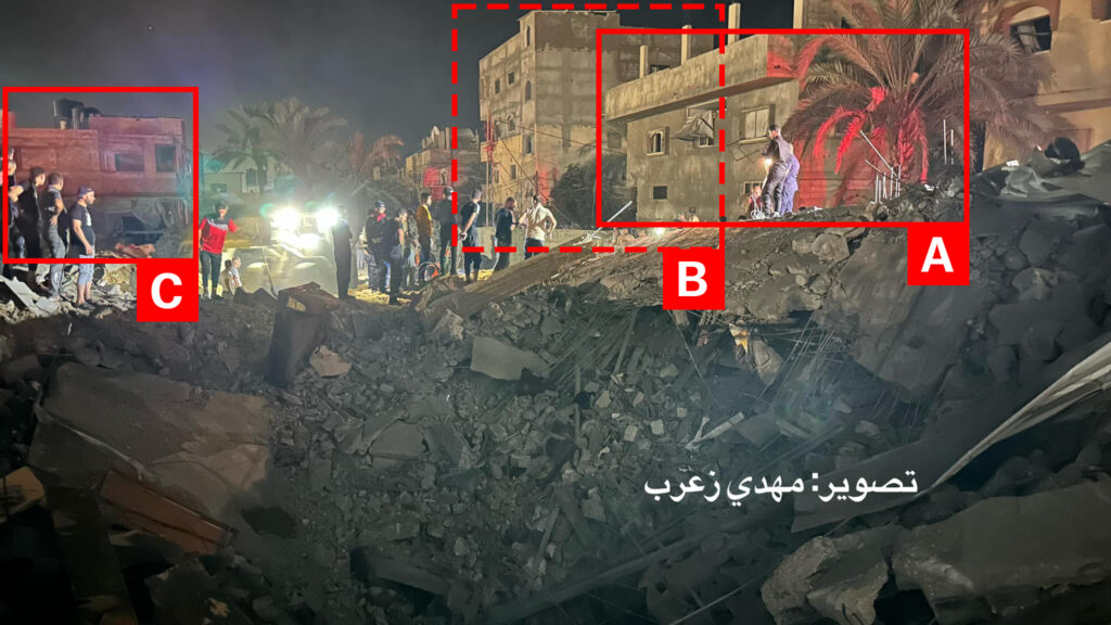Reports of the incident mention a residential building being struck in the vicinity of the Zorob roundabout (دوار الزعرب) in the city of Rafah (رفح). Analysing audio-visual material from sources, we have narrowed the location down to the following exact coordinates: 31.293442, 34.242939.