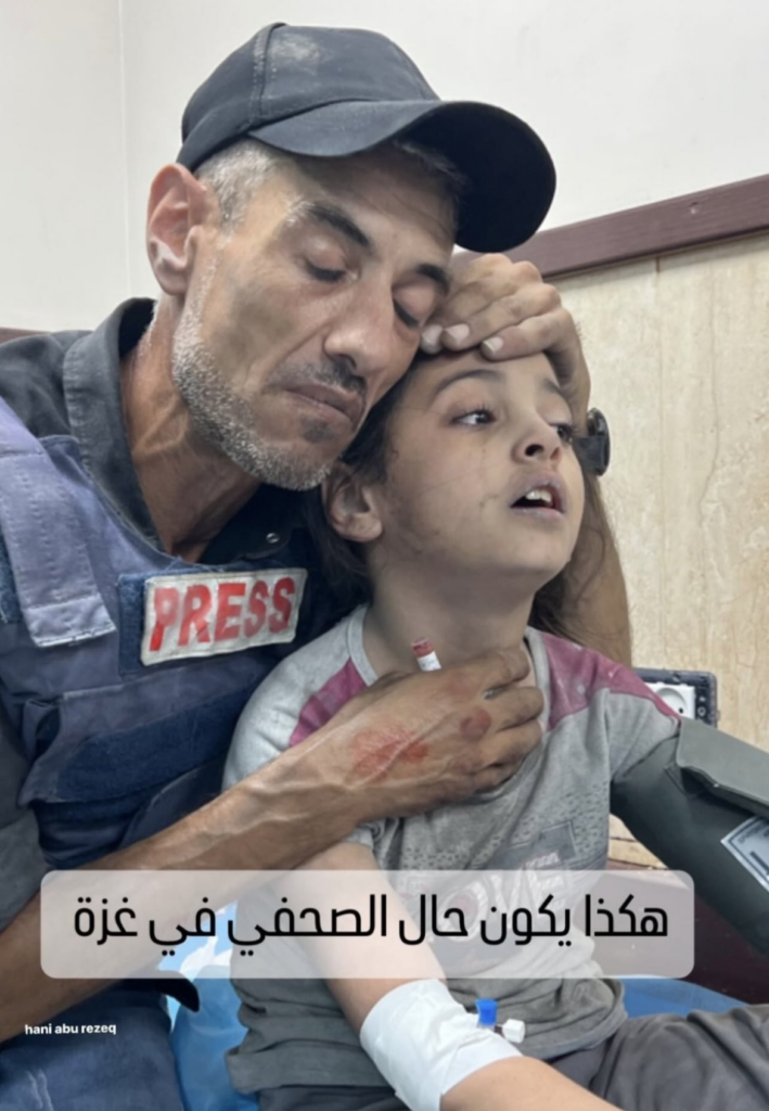 Khaled Al Ashqar learned of his wife’s death and the injuries of his children while reporting live from Nasser Hospital in Khan Younis. After hearing the news, he said on air: “Save us from the crimes of genocide. [Israel] is brutal and does not differentiate between anyone. My wife is not the first, so my cousin, her son, and her brother-in-law were with her…I lost the love of my life today.” Videos from Shehab Agency show Khaled Al Ashqar holding his injured daughter in the hospital as medics attend to her and a video posted by Khaled Abu Ahour shows Karam Al-Ashqar, another of Khaled and Islam’s children, crying for the loss of his mother.