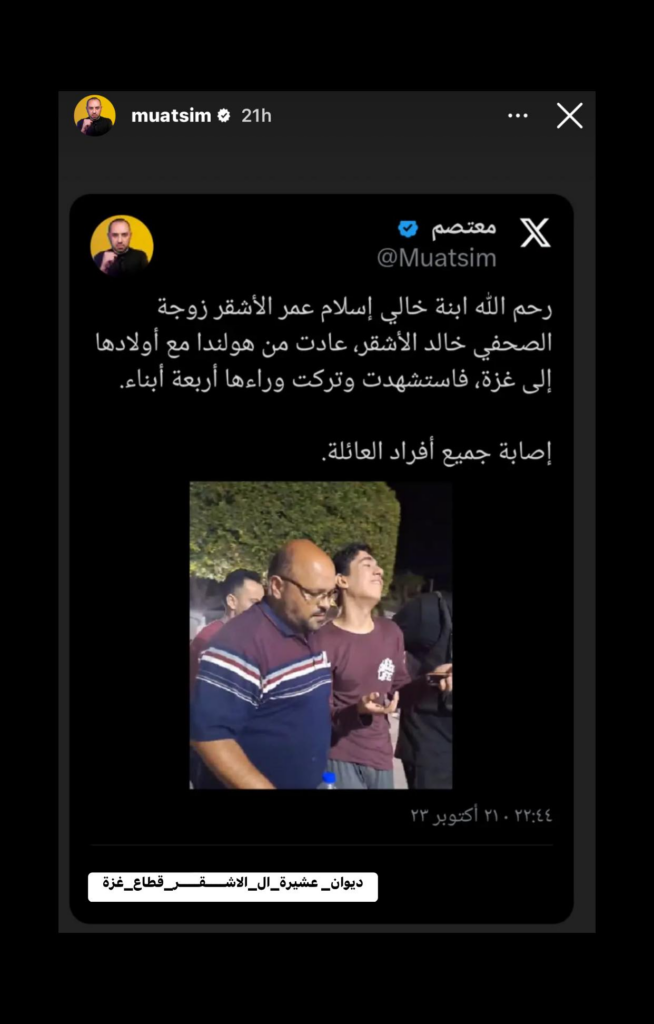 On October 21, 2023, an alleged Israeli airstrike killed 34-year-old Islam Omar Al Ashqar, a Dutch citizen and wife of Palestinian journalist Khaled Al Ashqar, and injured Haya Al Ashqar and Sham Al Ashqar, Islam and Khaled’s daughters, and Umm Hadi Al Ashqar, Islam’s mother, in the Nuseirat refugee camp in Deir al Balah, Gaza.