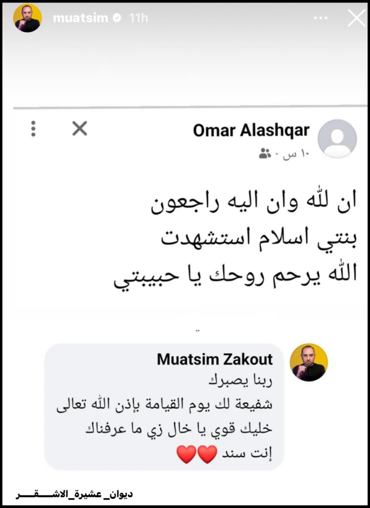 A tweet from photojournalist @HosamSalemG gave condolences to his colleague Khaled Al-Ashqar and “thank God for the safety of his brother’s children, our colleague Muhammad Al-Ashqar” who was also affected by the bombing. A post from Omar Basher described Islam as “one of the kindest and most generous people”.