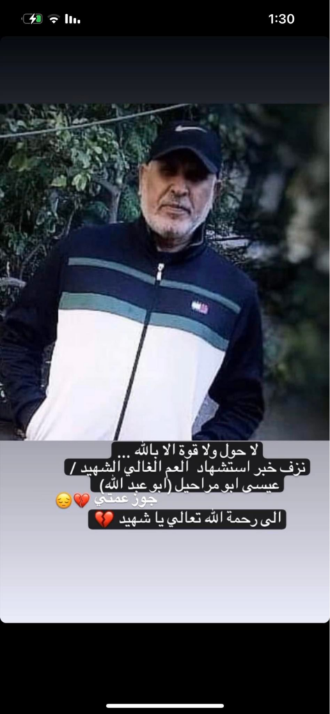 An outpouring of grief from the victims’ friends and extended family were expressed on social media. Facebook user Yasser Youssef remembered Issa Abu Marahil as a “sports captain” who was “one of the cadres of Ahly Nuseirat Club.” A photo attached shows Issa in a baseball cap and sports jacket. The Facebook page of Nuseirat Camp further remembered him as a “kind-hearted Hajj”, attaching a picture of him in a black three-piece suit.