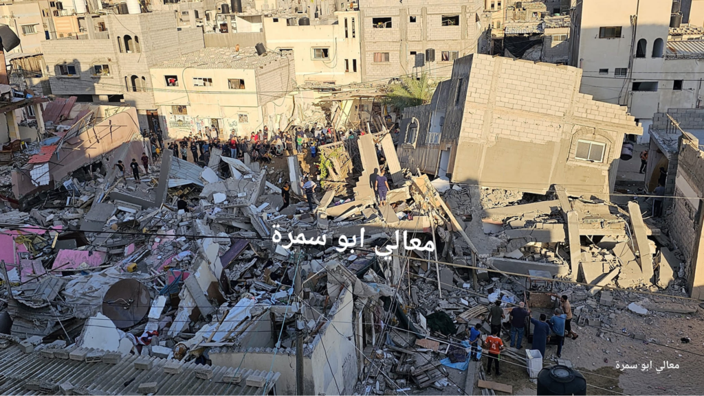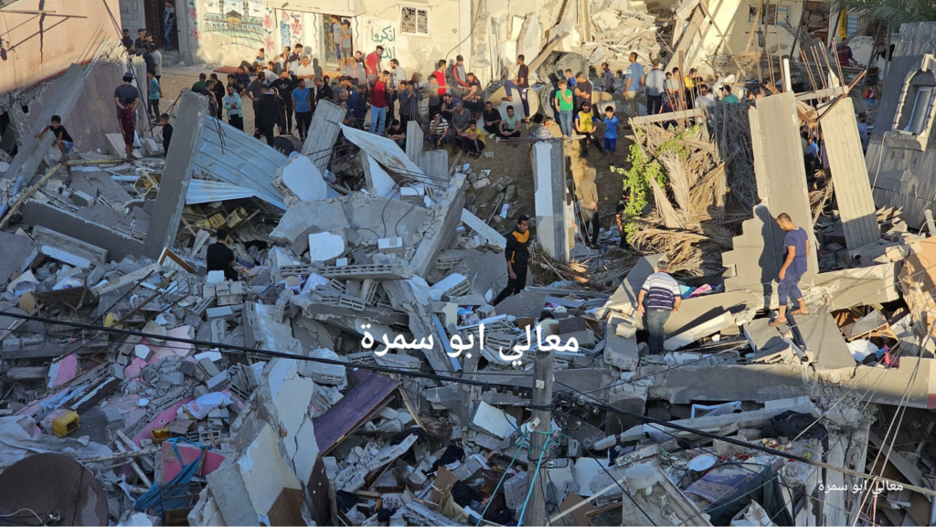 Alwatan voice reported “At dawn… dozens of martyrs and wounded in new Israeli targets in the Gaza Strip…According to what was reported by the Ministry of Interior and National Security in Gaza, the [Israeli] aircraft bombed a house for the “Al-Hawajri” family in Deir Balah in the central Gaza Strip, and there were a number of martyrs and wounded.” Similarly, @qudsn posted on X, “The [Israeli] aircraft bombed a house for the Al-Hawajri family in Deir Balah, killing a number of family members and wounding them.” Photographs posted on Facebook by @Maaliepress1 show the complete destruction of the Al-Hawajri family home, with numerous people scouring through the rubble.