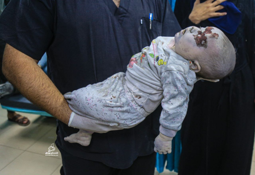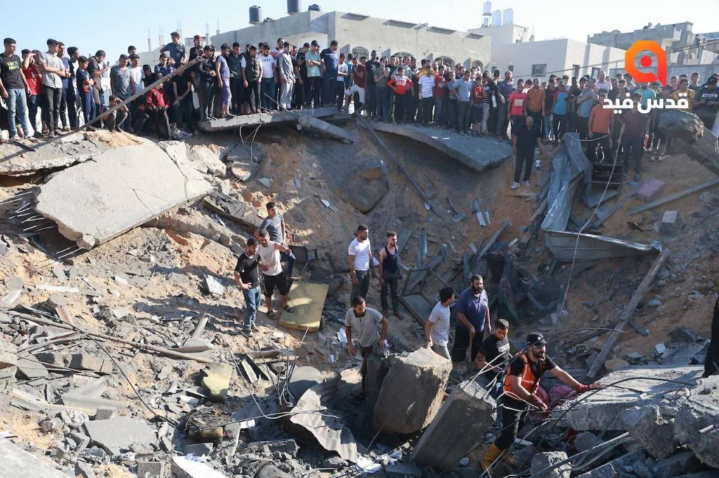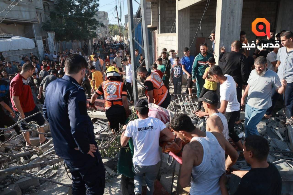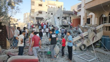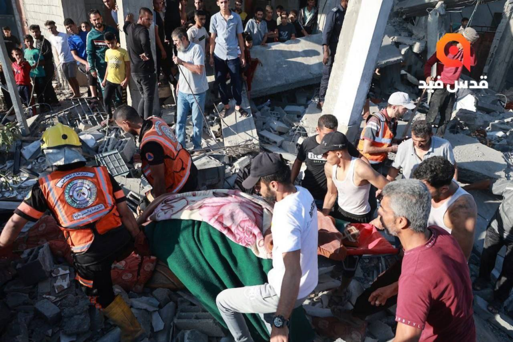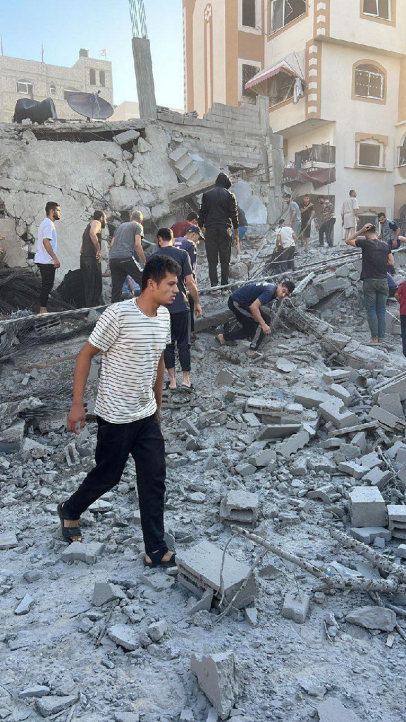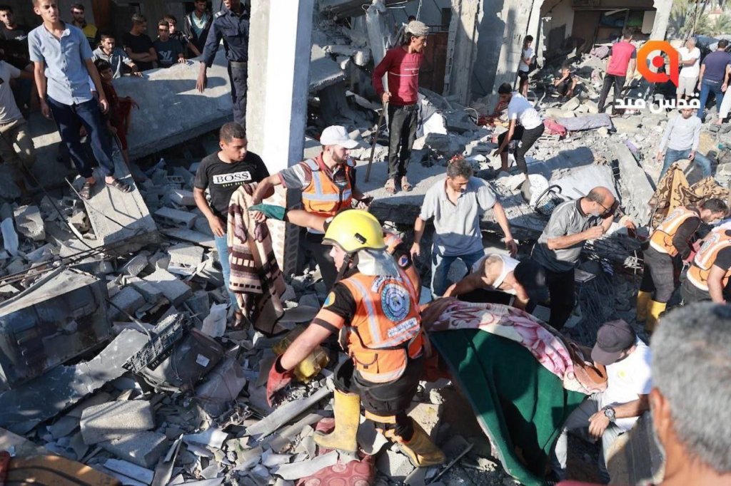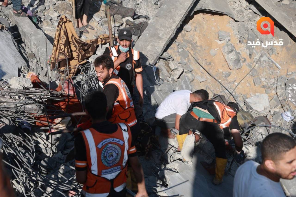 The aftermath of the strike was posted by Palestine Dialogue Network (@paldf) and Abu Kareem News showing the building reduced to rubble with local civilians and rescue workers sorting through the rubble. A post by Nuseirat Panorama showed the arrival of injured civilians, including a young man and an elderly man, at a local hospital while images posted by Nader Saad Abdul Haseeb show a woman with an injury to her face. Graphic images of a dead infant and a dead child arriving at the hospital were also posted by Nuseirat Panorama.