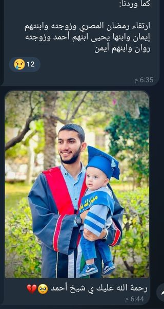 Ahmed al-Masry was the Muezzin and imam at the Abu Salim Mosque, and was described as a “beautiful preacher,” who had “memorized the Book of God.” Facebook user Reda Al-Bahrawi Abu Munis claimed that he left behind “a legacy of faith and noble service” and was a “symbol of dedication and sincerity.” His sacrifice, Reda wrote, “reminds us of unity and dedication to serving God and society.” In a picture included by Twitter/X user Arafa al-Masry, he can be seen carrying his son, wearing graduation regalia. His son Ayman, has his father’s graduation cap perched on his head.