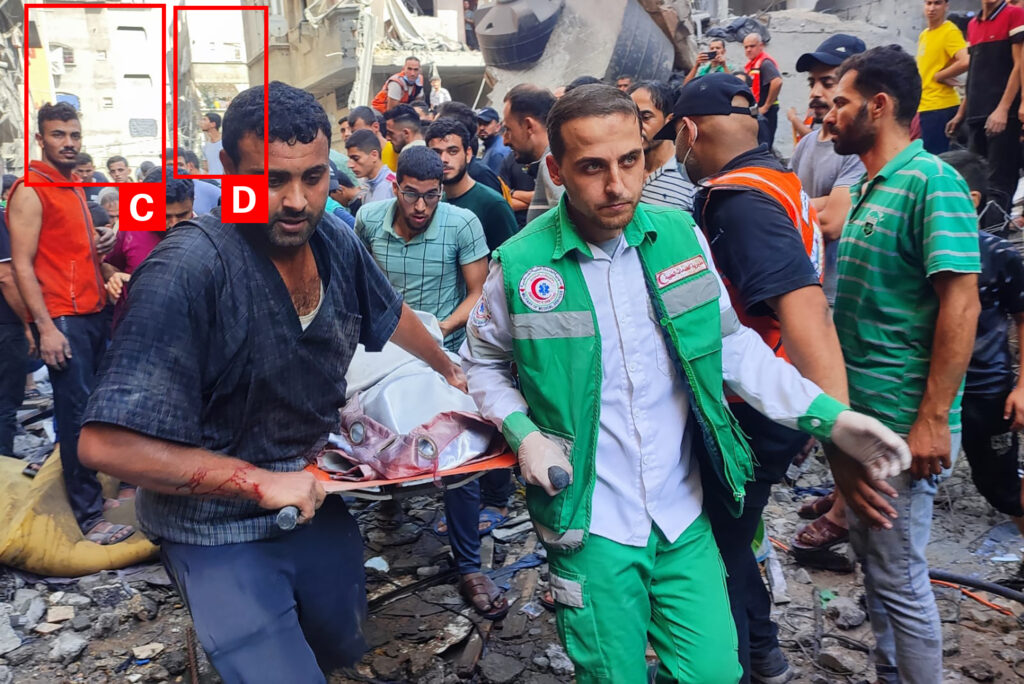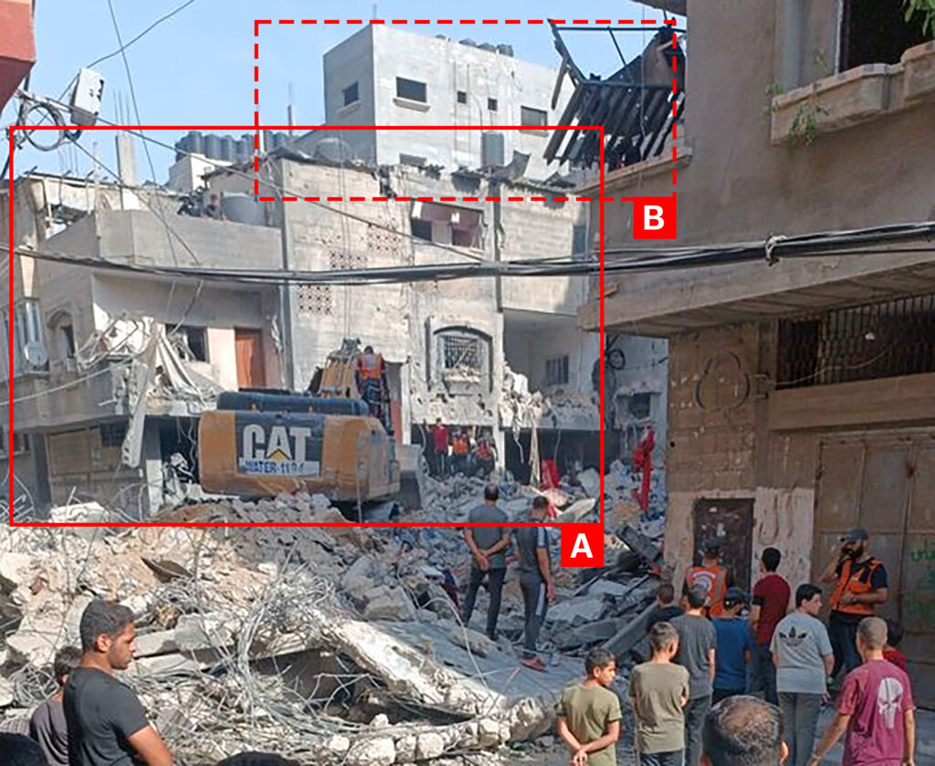 Reports of the incident mention a residential building being struck in the Al-Alami neighbourhood (العلمي) in the Jabalia Refugee Camp (مخيم جباليا). Analysing audio-visual material from sources, we have narrowed the location down to the following exact coordinates: 31.536461, 34.500622.