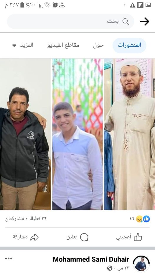 Others also took to social media to mourn the victims, including Amir Dhahir, cousin to Mutair and Sami, who posted a picture of Mutair proudly smiling and holding up a certificate, as well as neighbour Muhammad Hassan Abu Eyada and the Dhahir Family Forum, who posted images of the three men from when they were alive. The news agency Al Arabiya posted images of a funeral on Facebook, which was described as the funeral of the victims of three strikes, including the bombing of the Dhahir family home.