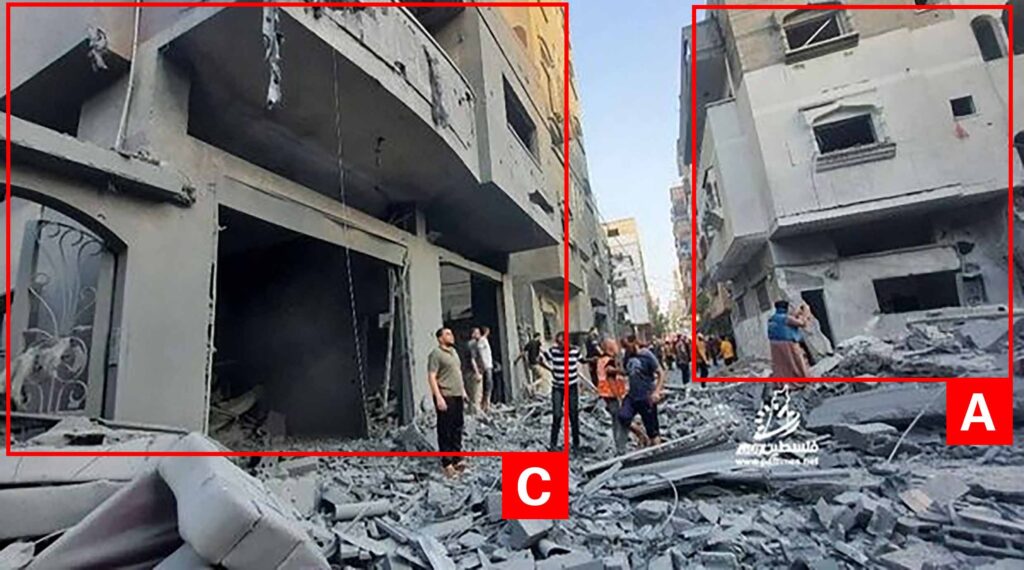 Reports of the incident mention a residential building being struck in the vicinity of the Sharia Court (المحكمة الشرعية) in the Nuseirat camp (مخيم النصيرات). Analysing audio-visual material from sources, we have narrowed the location down to the following exact coordinates: 31.445564, 34.396676.