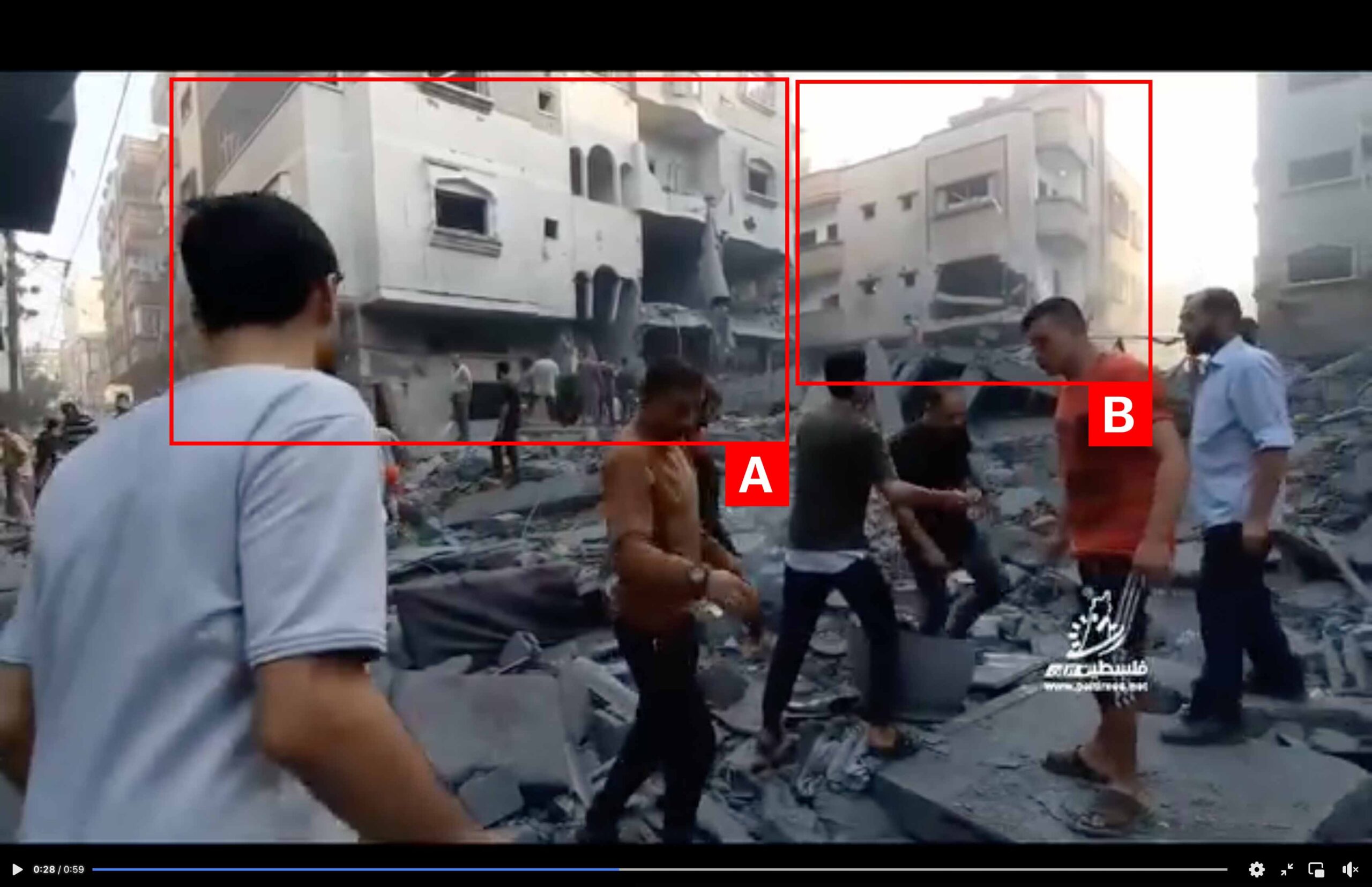 Reports of the incident mention a residential building being struck in the vicinity of the Sharia Court (المحكمة الشرعية) in the Nuseirat camp (مخيم النصيرات). Analysing audio-visual material from sources, we have narrowed the location down to the following exact coordinates: 31.445564, 34.396676.