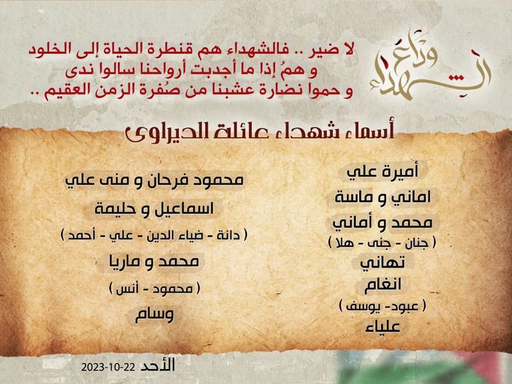 A Facebook post by a family member called Ehmed Elderawi said: “My beloved mother, my two generous sisters, and my niece are with the martyrs. My uncle, my aunt, their children, their wives, my brothers, their wives and children, and a group of guests. We ask God to have mercy on them,” The same day, he also shared a tribute image with the names of the family members who had passed away in the alleged incident, saying “They are not numbers… ”