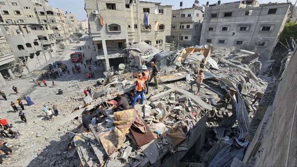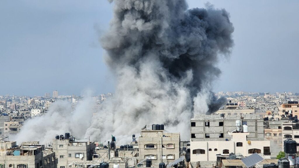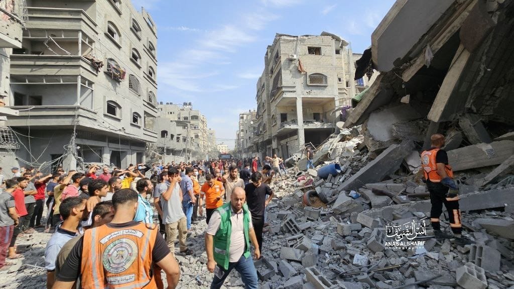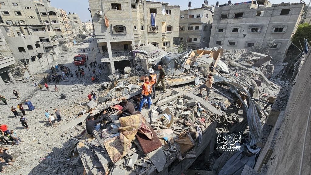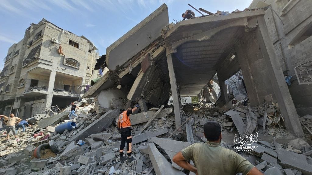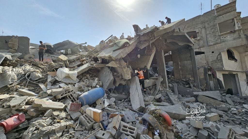 Shehab Agency’s initial reportage showed an image of a smoke cloud, purportedly from the alleged strike, with a caption stating that the Arooq family home had been bombed. Emergency Now Palestine also shared an image of a giant plume of smoke rising from the bombed home. Al-Qamari Al-Sawari Abu Shujaa shared a video, possibly from a neighboring home, of a family sitting together before a nearby explosion shatters the windows, injuring them and causing severe distress to the children. They added the caption “Israeli warplanes bomb an inhabited house near Nassar junction in the Jabaliya camp in northern Gaza, and there are a number of injuries and lives under the rubble.”