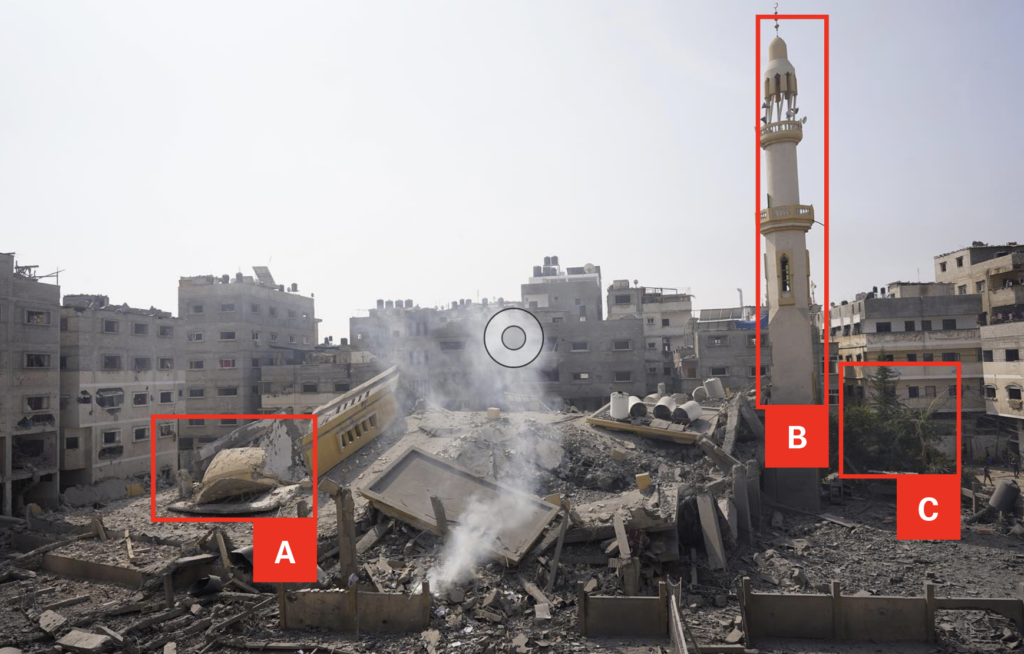 On Monday, October 23rd 2023, at around 12pm, an Israeli airstrike allegedly injured and killed dozens of civilians including children, and destroyed the al-Nour al-Mohammadi Mosque and neighbouring homes in the Sheikh Radwan neighbourhood of Gaza City. The mosque was located in the centre of a civilian area in Gaza City. The exact number of civilians killed and injured were not reported on, so Airwars has provided an estimated range based on qualitative descriptions of the event.