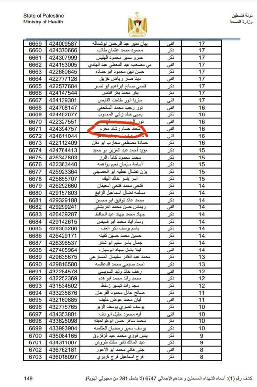 Where possible, Airwars has matched names with the Palestinian Ministry of Health list of nearly 7000 victims’ names and ID numbers released on October 26th.