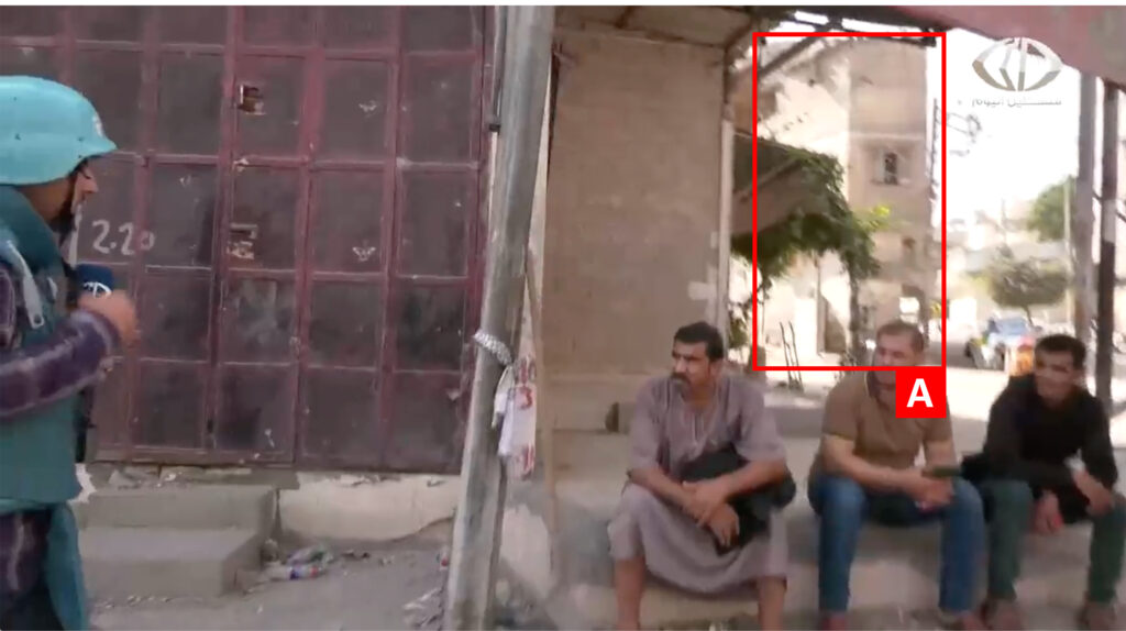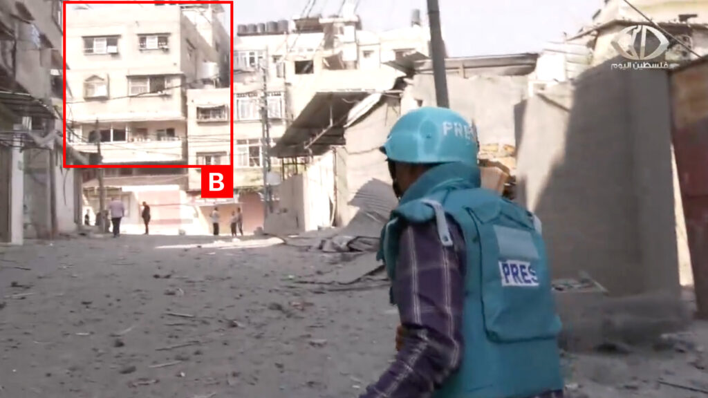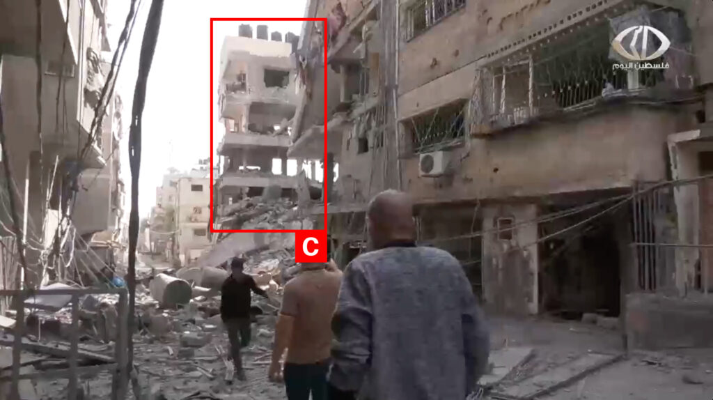 Reports of the incident mention residential buildings being struck on Yarmouk Street (شارع اليرموك) in the center of Gaza City (مدينة غزة). Analysing audio-visual material from sources, we have narrowed the location down to the following exact coordinates: 31.521718, 34.462692.