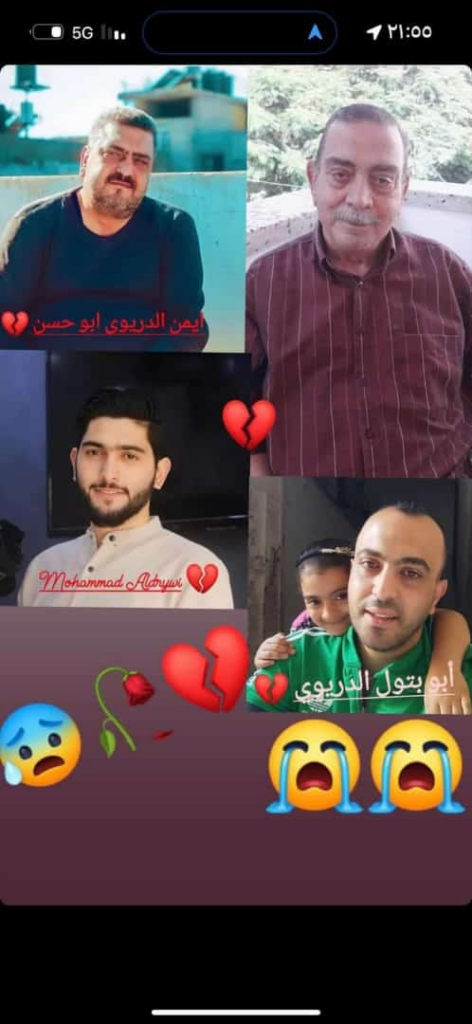 83-year-old Hajj Hassan Fawzi al-Dariwi was reportedly killed along with two of his sons, Iyad Hassan Fawzi al-Dariwi (Abu Batoul) and 50-year-old Ayman Hassan Fawzi al-Dariwi.