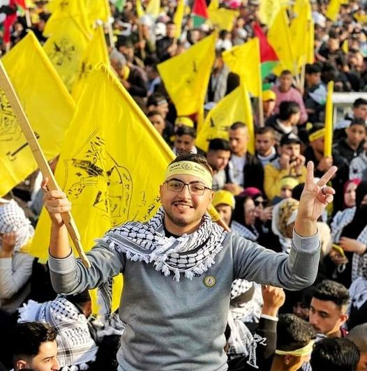 Mahmoud Naeem Hammoude posted an image of Hassan Ayman Hassan al-Dariwi, holding up a peace sign and a yellow flag at a Fatah rally.