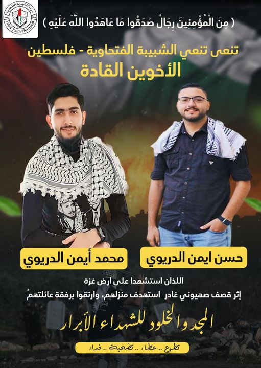 The official Facebook page for the Fatah Youth Movement posted a tribute to its two members, Muhammad Ayman Hassan al-Dariwi and Hassan Ayman Hassan al-Dariwi. The post referred to the brothers as heroes.
