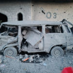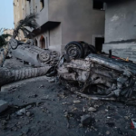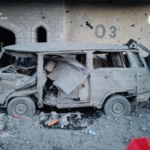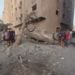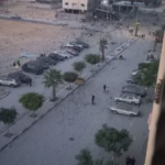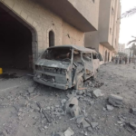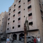 According to Hamad City media Facebook account, the building hosted many shops, including Al-Mashni Fresh and Frozen Shops and Zait and Za’atar Supermarket. They appear to have been destroyed. Windows and doors of the O2 and O3 towers were also broken, in addition to the muliple burnt cars on the street.