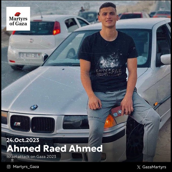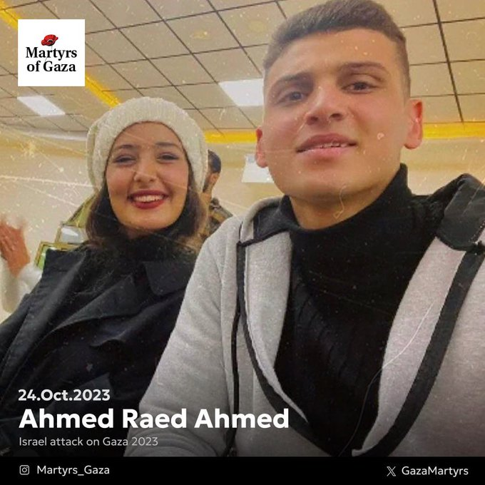 Fayrouz’s nephew, 20-year-old Ahmed Raed Ayyash Ahmed, was an additional casualty of the airstrike. The death of Ahmed Raed Ahmed was mourned in the Twitter/X account “Martyrs of Gaza”. Martyrs of Gaza shared the images of Ahmed, a young muscular man, and quoted Ahmed’s friend, Rahef Al-Shamali, who told about him the following: