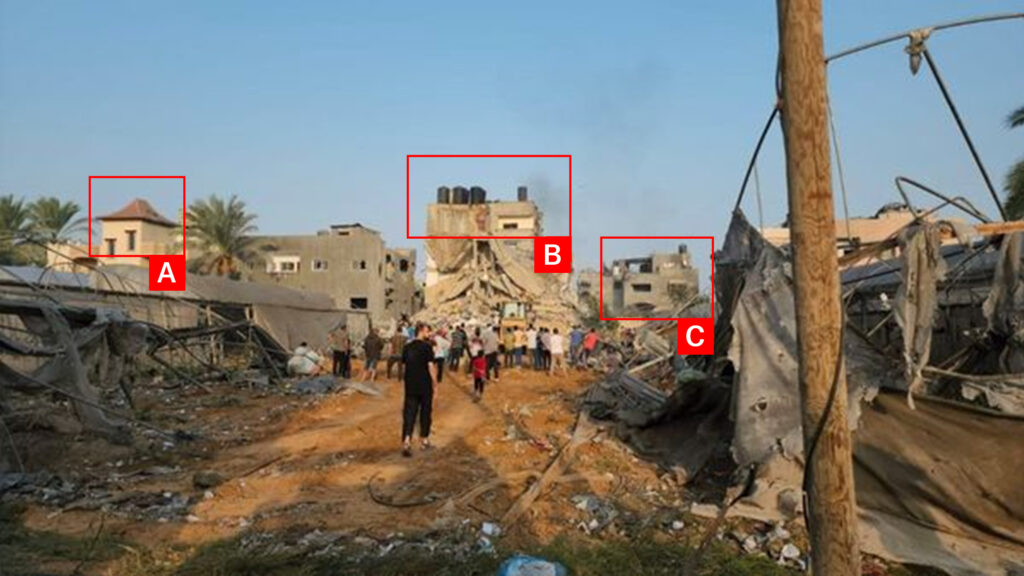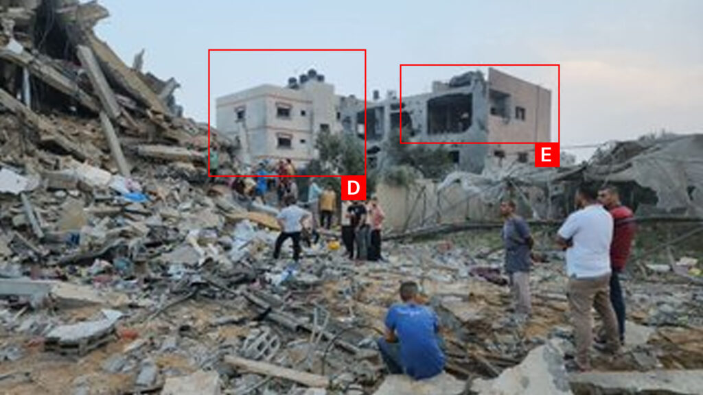 Reports of the incident mention a residential building being struck on Abu Hosni Street (شارع أبو حسني) in the town of Deir Al Balah (دير البلح). Analysing visual material from sources, we have narrowed the location down to the following exact coordinates: 31.416440, 34.356233.