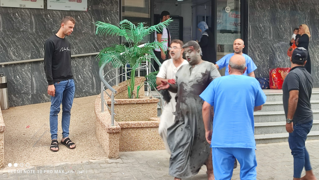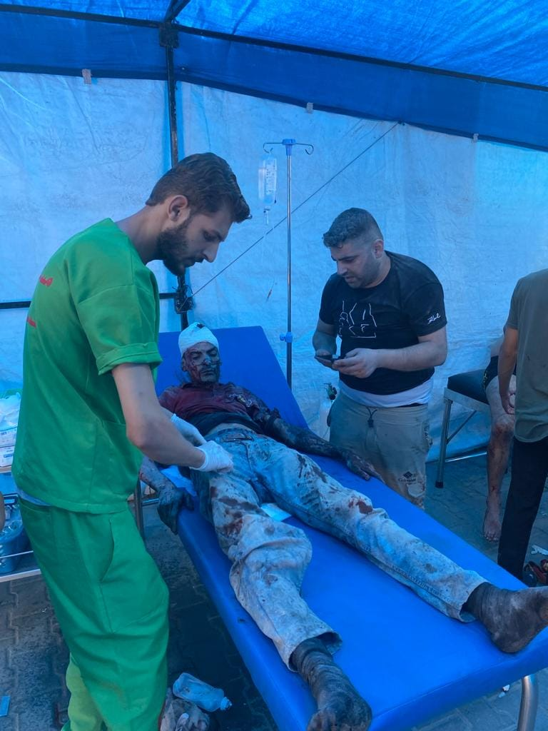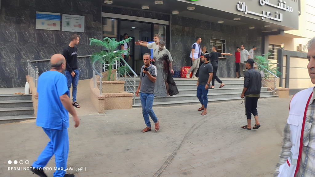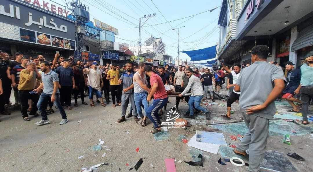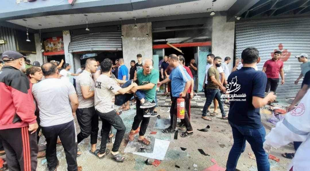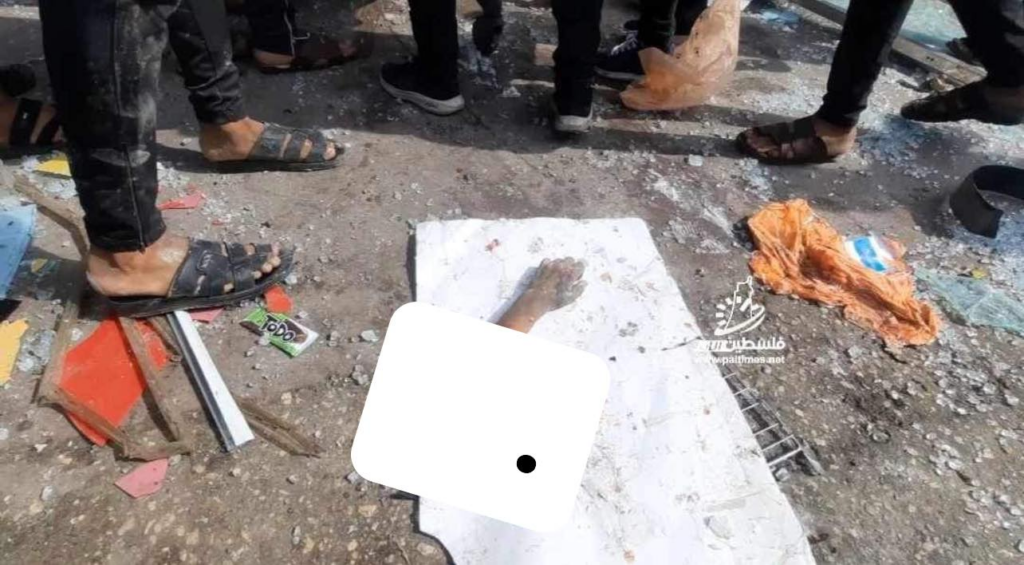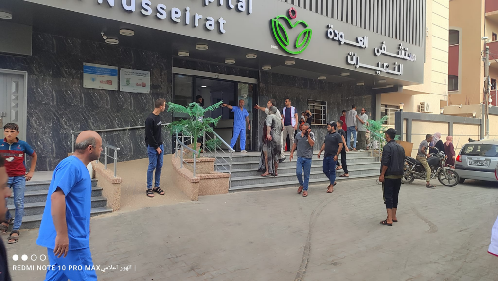 On Facebook, Sanaa Mahmoud, Abu Osama Aljazaairi Almorabet, Mohammad Ismail al-Hour, Adam Nawas, Hossam Youssef, Abu Jameel al-ashqar and Khaleel Alghaffari shared images and video compilations documenting the immediate aftermath of the strike, illustrating its destructive impact on the infrastructure where citizens “bought their household supplies,” according to Emad J. Abushawiesh. Their posts captured moments of chaos and human suffering, including one of a dazed man–possibly the injured Dr. Mahmoud Hamad– stumbling outside of a hospital, covered in dust and blood, and other scenes of children being rescued from under the rubble and hurriedly transported to ambulances bound for al-Awda Hospital in al-Nuseirat. Ibrahem Elian reported that some of the casualties sustained “serious injuries” necessitating “amputations.” Additionally, Jenine News reported that the airstrike targeted a commercial complex housing a humanitarian aid distribution point, as well as “large numbers” of shoppers and displaced individuals.