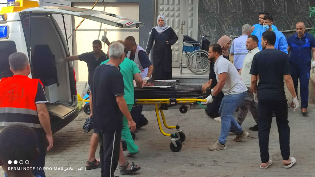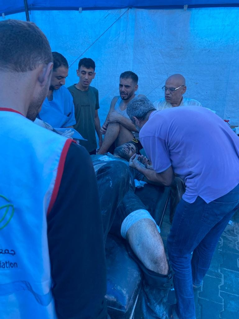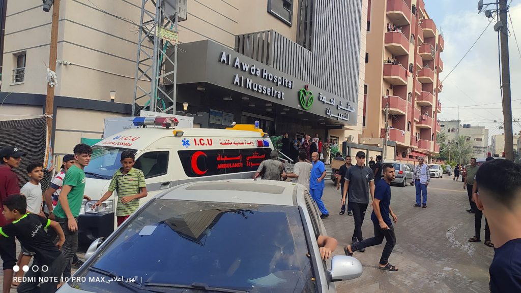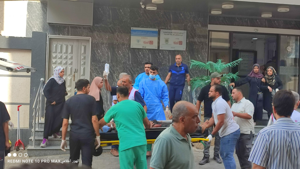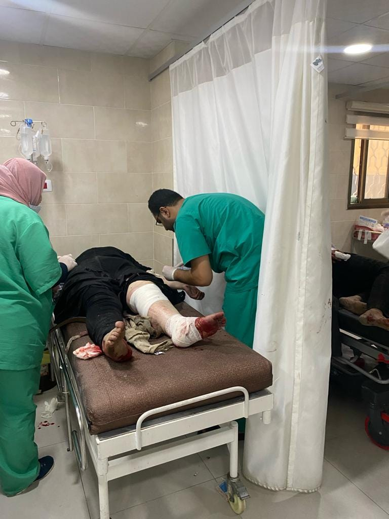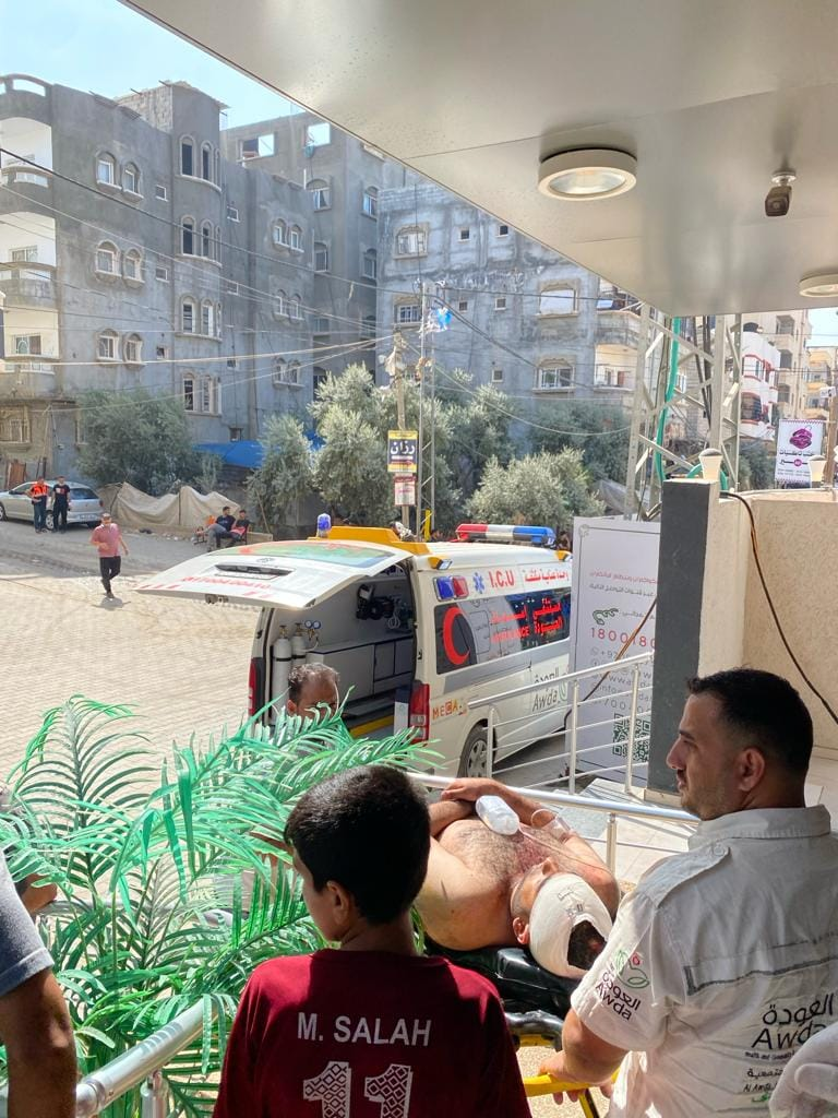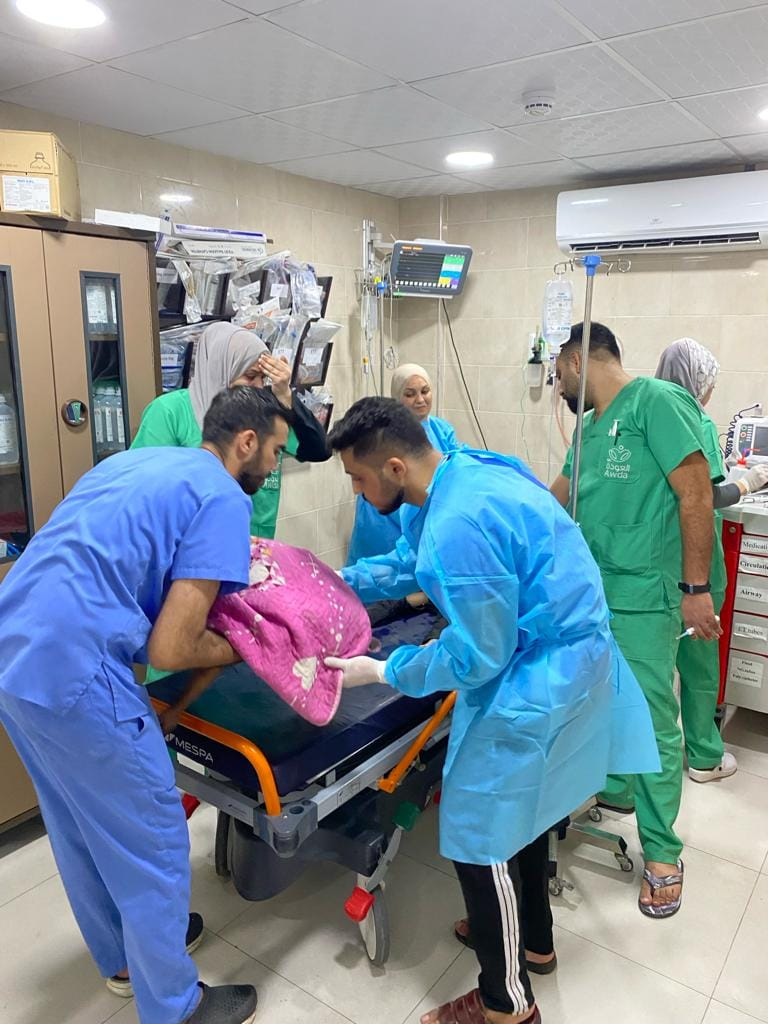 Al Awda Health and Community Association received five of those killed and 80 of those injured, and at least 10 of the 80 patients required transfer to al-Aqsa Hospital as the emergency room reached full capacity, as depicted in the images.