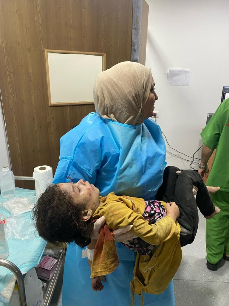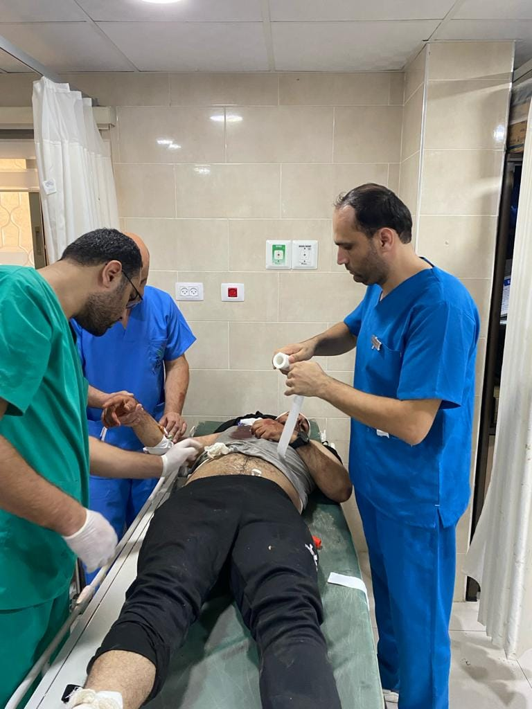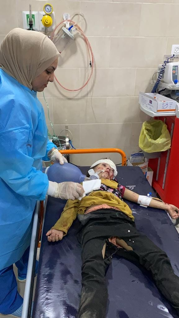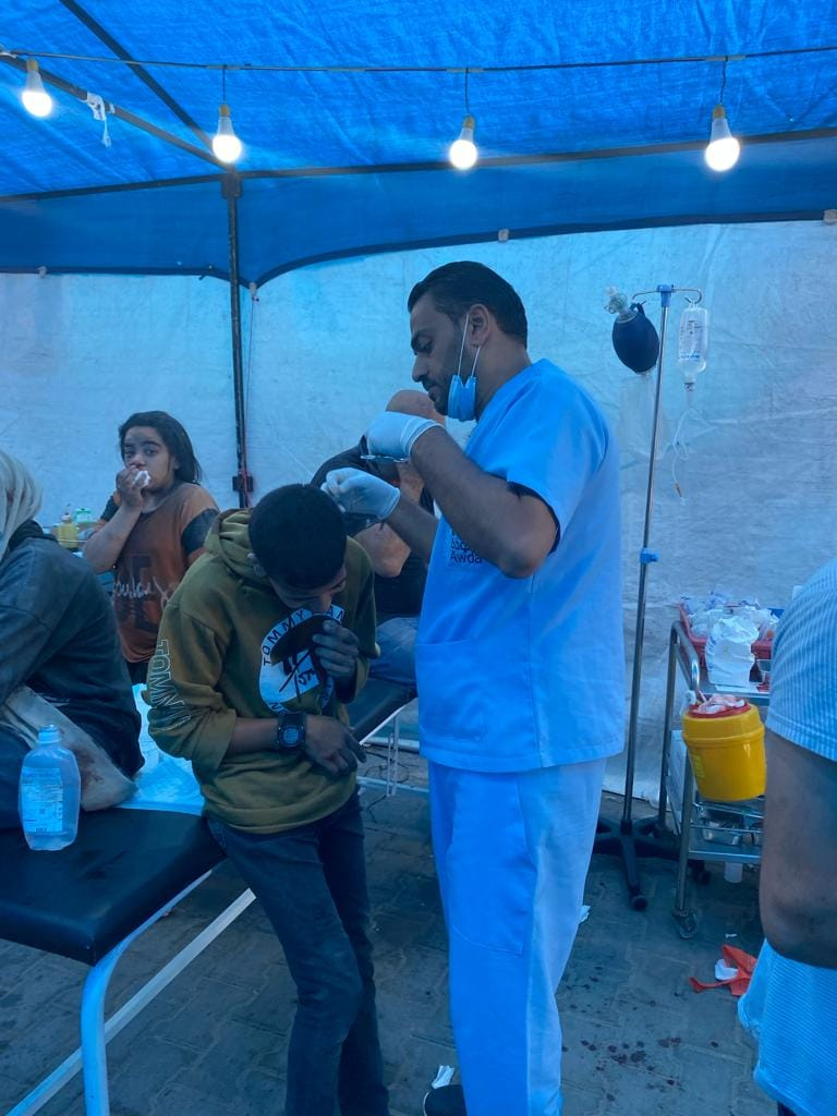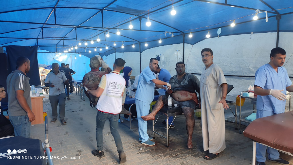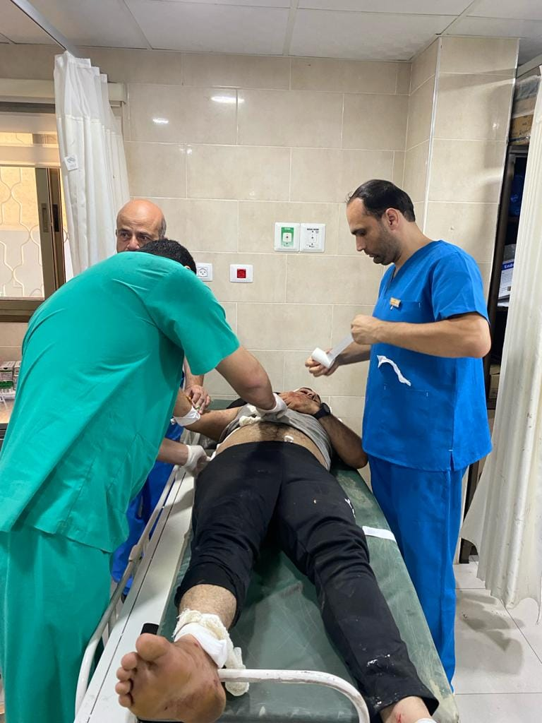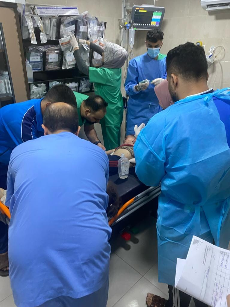 Al Awda Health and Community Association received five of those killed and 80 of those injured, and at least 10 of the 80 patients required transfer to al-Aqsa Hospital as the emergency room reached full capacity, as depicted in the images.