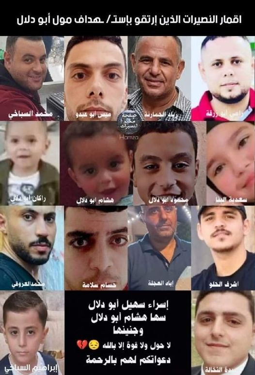 Additionally, Ibrahim al-Sabakhi’s grandfather, Khaleel Ibrahim, Adam al-Helou’s brother-in-law, Iyad Abu Ahmad, and Muhammad al-Arouqi’s acquaintance, Khaleel al Ghaffari, expressed their condolences. Others who contributed included Adam al-Helou’s friend Abdelrahman Naser Eid, and Israa Suhail Abu Dalal’s “beloved” brother Muhannad Abu Dalal. Muhammad Hassan al-Sabakhi’s niece, Nour Sabakhi, and Hossam Akram Salama’s cousins, Abu Mohammad and Nadal Salame, joined in expressing their sorrow.