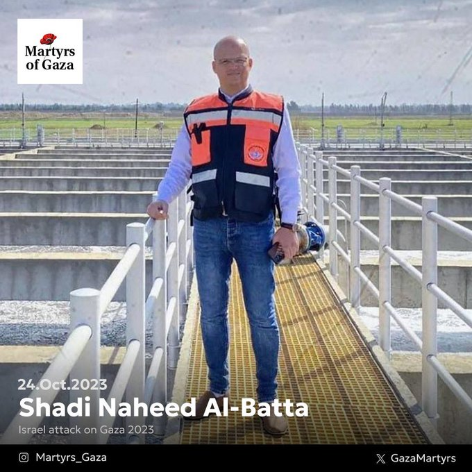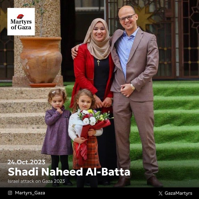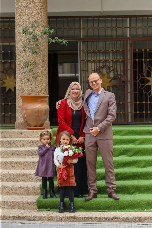 Shadi Nahed al-Batta was a 35 year old engineer who held a masters degree in Water and Environment and was the director of the central treatment plant in Khan Younis for the Coastal Municipalities Water Authority. Shadi was described by friends and family as young, ambitious and kind, “never refusing a request, and always ready to assist everyone.” Mohammed el Batta shared a photo online of Shadi standing on the steps with his two young children and his wife, to whom he had been married for eight years. One of his daughters holds a bouquet of flowers, while Shadi, wearing a grey suit and a blue shirt, embraced his wife as they smile toward the camera. @GazaMartys shared a comment from Shadi’s wife, which read ‘Shadi, you were a symbol of courage and sacrifice. You left behind beautiful memories for us from the 8 years we spent together with our small family.’