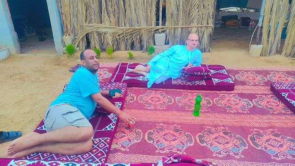 In a photo shared on social media Fadl Saq Allah is depicted as a middle aged man sitting on a sofa in a beige shirt and grey trousers. His nephew Abdul Rahman Mazen Al-Qishawi is depicted in a standing pose wearing white trousers and a white shirt.