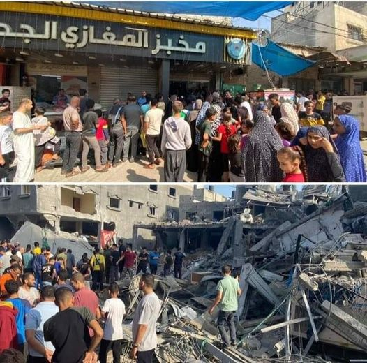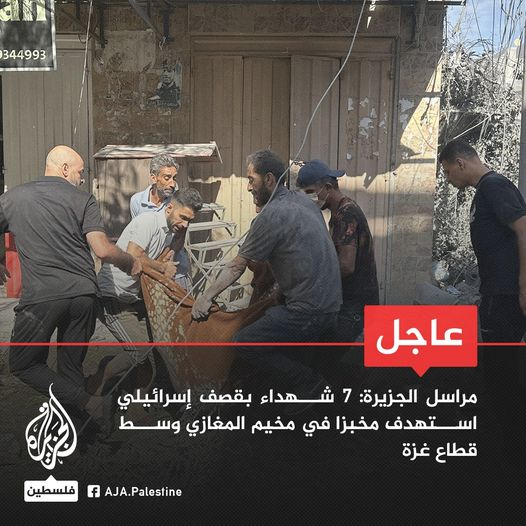 Quds Press and Raya FM quoted the Government Media Office in Gaza, which announced the death of 10 individuals and the injury of dozens as a result of the alleged strike on “the only bakery of the Maghazi camp in central Gaza strip”, and that the bakery was “completely destroyed”, “a large hole was left in its place, in addition to the demolition of a number of houses surrounding the center of the camp.”