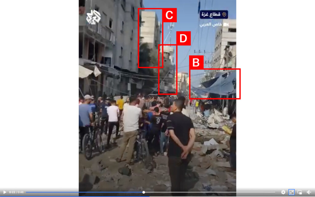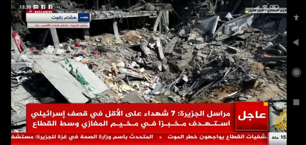 In a post on Facebook, Saeed al-Asar stated that “planes bombed a bakery in Al Maghazi camp, and there are 6 martyrs so far.” Later reporting from Shehab Agency and Al Jazeera mentioned seven killed “and a number of wounded” as a result of the alleged Israeli airstrike, with Al Jazeera sharing an image of rescue efforts. Al Quds news agency shared an image of the bakery before and after being destroyed by the alleged strike, while Al Jazeera posted a video with aerial drone footage of the rubble and destruction, with the caption “The extent of the massive destruction as a result of the Israeli bombing (on) a bakery in the Al Maghazi refugee camp in the central Gaza Strip, resulting in the death of 8 people.” Al Araby TV posted a video of crowds gathered around the rubble of the destroyed structure, and heavy damage can be seen to the buildings near it. The caption stated that there were “a number of deaths and injuries.”