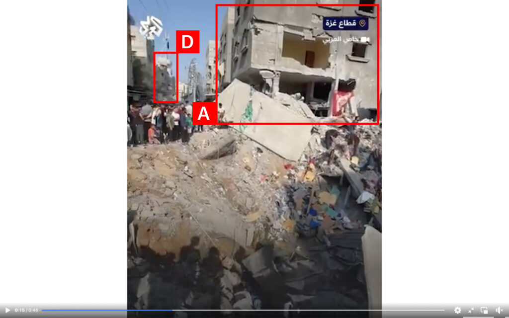 Reports of the incident mention a residential building being struck in the Al Maghazi camp (مخيم المغاز) in the Deir Al Balah region (محافظة دير البلح). Analysing visual material from sources we have narrowed down the location to these exact coordinates: 31.421956, 34.383514.