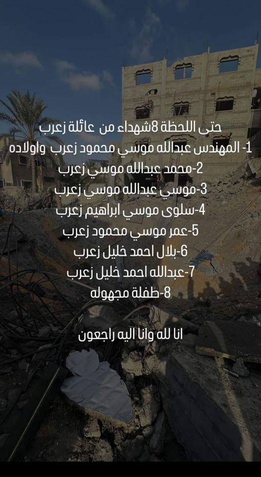In multiple posts on social media, family members reported the names of 16 individuals reportedly killed in the incident including engineer Abdullah Musa Mahmoud Zorob, his wife Lamis Mahmoud Noman Zorob, and their three sons 5-year-old Musa Abdullah Musa Zorob, 2-year-old Ibrahim Abdullah Musa Zorob and 7-year-old Muhammad Abdullah Musa Zorob.